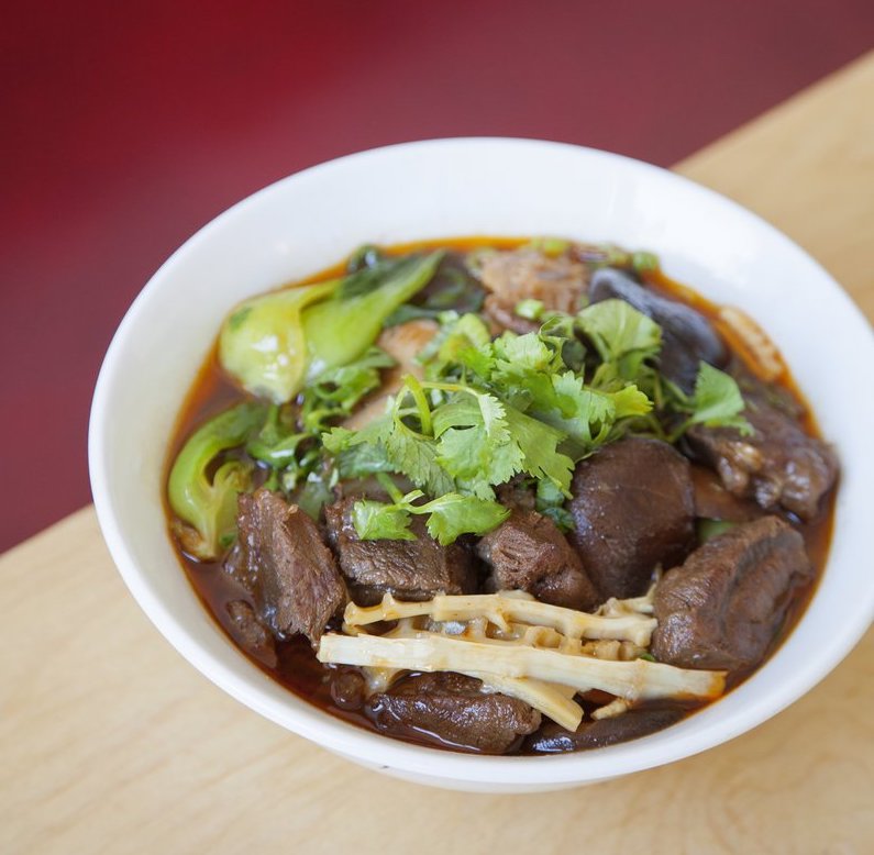 Beef, shiitake mushroom, bamboo shoots, chili pepper, bok choy