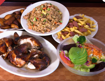 Grilled steak, friend eggs, french fries, plantains, and rice