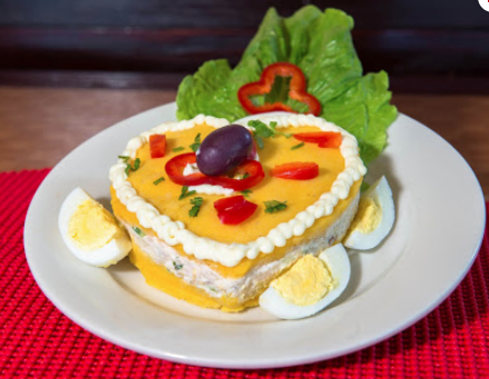 Aji de Gallina – shredded chicken with rice, potatoes, and creamy spicy sauce