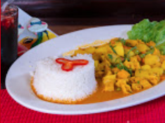 Seasoned fish with seafood, in spicy Peruvian sauce and rice
