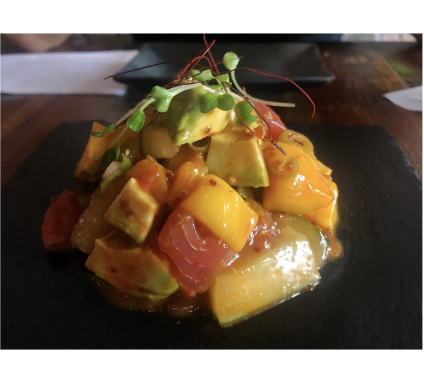 Tuna, avocado, cucumber, mango, scallion with spicy crunch garlic sauce